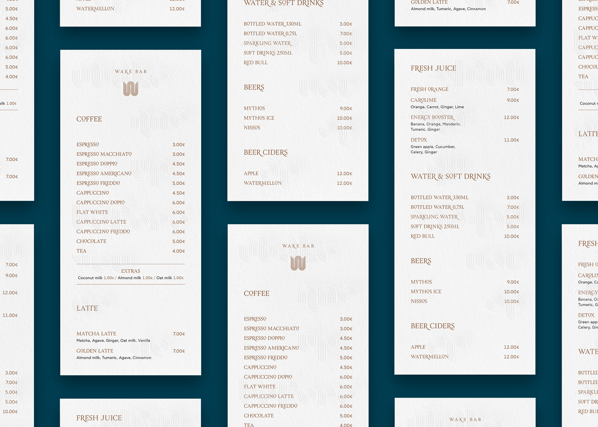 Wake is an all-day bar situated in the cosmopolitan streets of the Greek island Mykonos. We were commissioned to design Wake's logotype, and the in-house menus and applications.