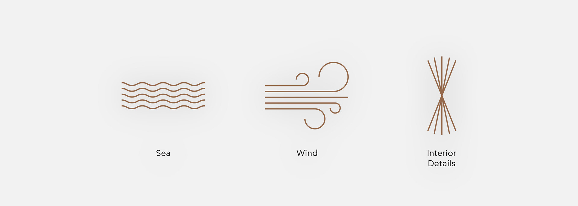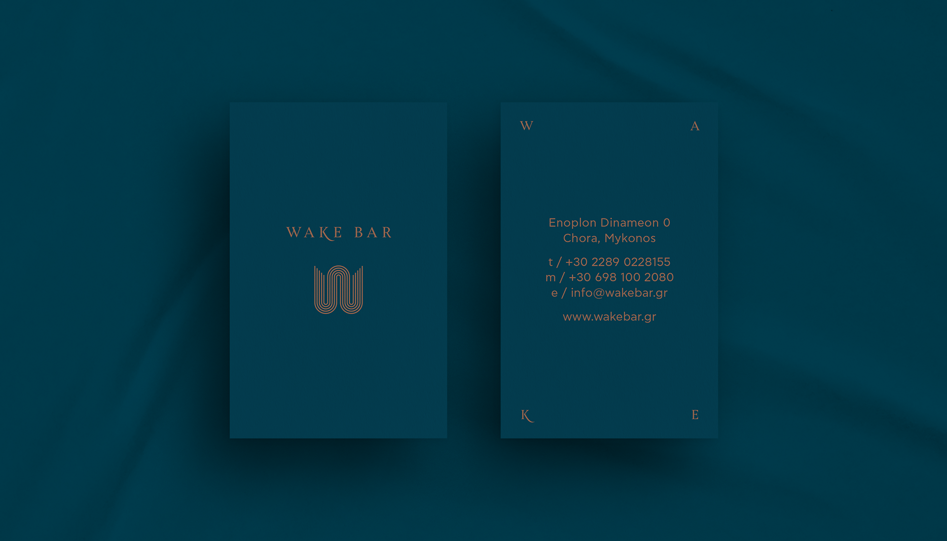 We created a contemporary symbol using the letter "W", the first letter of the bar's name. As for its design and form, we drew inspiration from the Cycladic Sea, the wind, one of the most characteristic elements of Mykonos, and from various decorative elements in Wake's interior.
